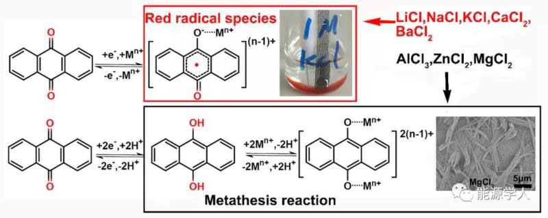 進一步地,研究者利用掃描電子顯微鏡觀察了AQ電極循環(huán)前,第一次還原后的電極形貌,如圖3所示。相比于循環(huán)前平整的電極表面,在不同電解液中經(jīng)過第一次還原之后的電極表面出現(xiàn)了很多棒狀物質(zhì),這表明了有物質(zhì)在電極表面成核和生長。結(jié)合還原電勢的推斷,研究者提出了質(zhì)子輔助金屬離子置換反應(yīng)機理,AQ獲得兩電子與質(zhì)子耦合生成AQ-H2,而AQ-H2在水中溶解度要高于AQ,因此有部分AQ-H2從電極內(nèi)部溶出到電極表面,與金屬離子發(fā)生置換生成AQ-M,M為Al, Zn, Mg。AQ-M在電極表面成核和生長為棒狀新相。反應(yīng)機理如圖4所示。