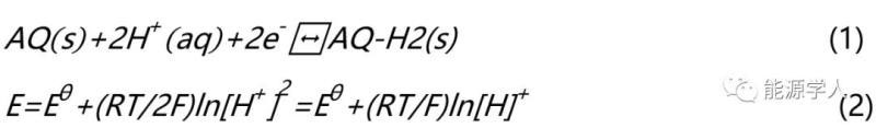 那為什么在1M HCl,AlCl3,ZnCl2和MgCl2電解液中沒出現(xiàn)紅色物質(zhì)呢?圖1f中AQ電極在1M HCl中的CV曲線表明了AQ經(jīng)歷了單步雙電子反應(yīng)生成蒽二酚(AQ-H2), 如反應(yīng)方程式1所示。而根據(jù)Nernst方程2,該反應(yīng)的熱力學(xué)平衡電位與質(zhì)子濃度密切相關(guān),質(zhì)子濃度越高,電位越正。這與AQ電極在1M AlCl3,ZnCl2和MgCl2電解液中觀察到的還原電勢趨勢一致,加上他們之間的還原峰型相似,因此我們推斷質(zhì)子在還原過程中參與了反應(yīng),決定了還原電勢的大小。