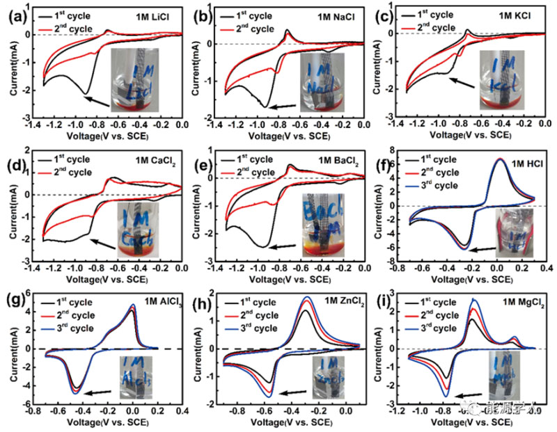 AQ是一類典型的醌類化合物,大量應(yīng)用于染料中間體,雙氧水制備和造紙等工業(yè)中。AQ為黃色結(jié)晶粉末,在水中溶解度很?。?0℃下為5mg L-1),可以實現(xiàn)兩電子轉(zhuǎn)移,理論比容量為257 mAhg-1。研究者測試了AQ電極在不同水溶液電解液的循環(huán)伏安曲線(CV)。如圖1所示,出現(xiàn)了非常有意思的反應(yīng)現(xiàn)象。在1M LiCl, NaCl, KCl, CaCl2和BaCl2電解液中,AQ電極在第一圈還原過程中,產(chǎn)生了大量紅色物質(zhì),并脫離電極溶入電解液中,導(dǎo)致電極反應(yīng)不可逆,但反應(yīng)的還原電勢比較接近,在-0.9到-1.0V(vs. SCE)之間;而在1M HCl, AlCl3, ZnCl2和MgCl2電解液中,AQ電極反應(yīng)可逆,溶液也一直保持澄清,但還原電勢各不相同,總體趨勢是溶液pH越小,還原電勢越高。以上現(xiàn)象表明不同的水溶液電解液對AQ的氧化還原性質(zhì)有著顯著的影響。