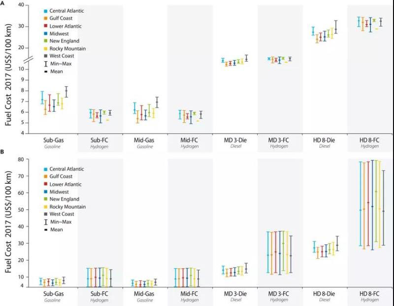 除制氫的電力成本外,通過比較不同類型燃料的成本,探討氫燃料電池電動(dòng)車與汽油車、柴油車在區(qū)域范圍內(nèi)的成本競爭力。