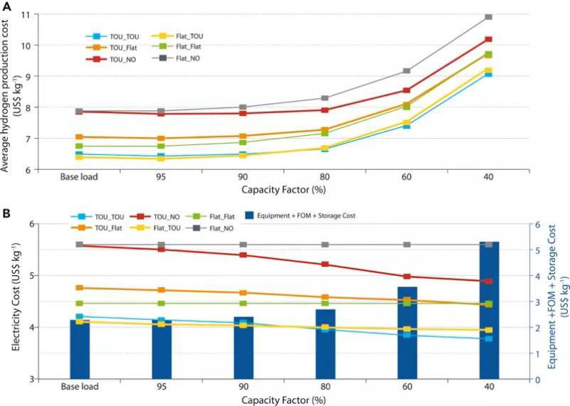1)對于不對基本電費(fèi)或峰值電費(fèi)使用動(dòng)態(tài)定價(jià)的模式,總氫生產(chǎn)成本(每種類別的電費(fèi)的平均成本)隨著產(chǎn)能因子的降低而單調(diào)增加。這是因?yàn)閷τ贔lat_NO和Flat_Flat電費(fèi),電力成本是恒定的,而設(shè)備,固定操作和維護(hù)(FOM)和存儲成本隨產(chǎn)能因子的降低而按比例增加。