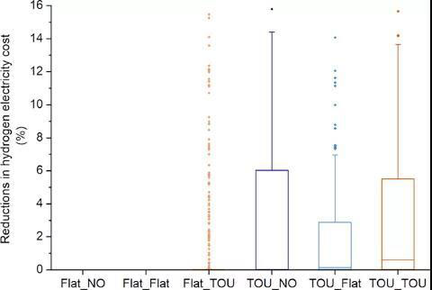 通常,F(xiàn)lat_NO型電費(fèi)的氫氣生產(chǎn)成本比Flat_Flat和Flat_TOU型電費(fèi)昂貴。使用動(dòng)態(tài)定價(jià)費(fèi)可將TOU_NO,TOU_Flat和TOU_TOU的制氫電力成本分別降低2.4%,1.2%和2.6%。靈活的電費(fèi)動(dòng)態(tài)定價(jià)模式的結(jié)果說明了在合適的地點(diǎn)和合適的時(shí)間運(yùn)行電解槽的重要性。