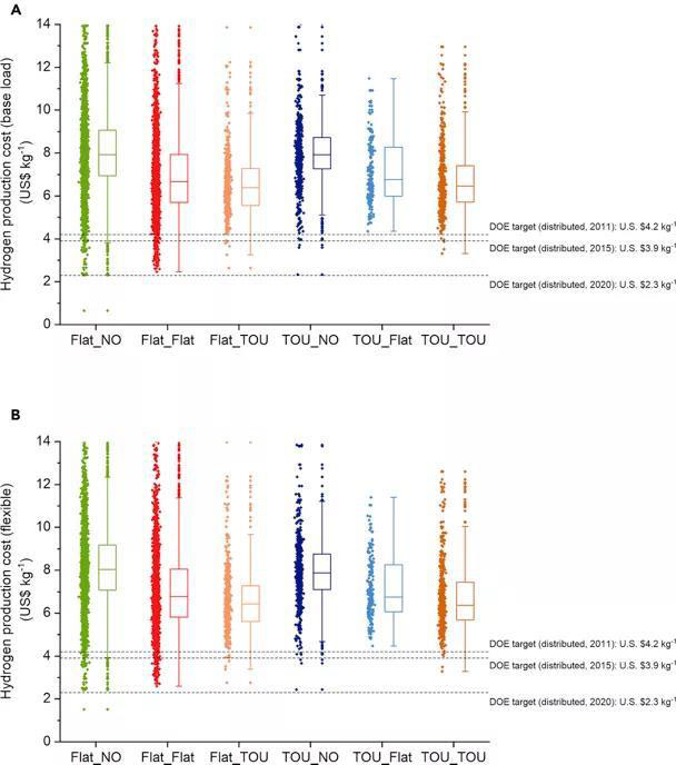 本研究中采用RODeO實(shí)驗(yàn)程序結(jié)合要點(diǎn)1分析的電費(fèi)對電解槽的基本負(fù)荷和靈活運(yùn)行模式的制氫成本進(jìn)行估算。美國能源部(DOE)電解制氫的技術(shù)目標(biāo)分別是2011年,2015年和2020年分別為4.2千克/美元,3.9千克/美元和2.3千克/美元。成本估算發(fā)現(xiàn),F(xiàn)lat_Flat,F(xiàn)lat_NO,F(xiàn)lat_TOU和TOU_TOU四種類型的電價(jià)結(jié)構(gòu)下電解制氫成本已經(jīng)實(shí)現(xiàn)了美國能源部2011年的氫氣生產(chǎn)目標(biāo)。此外,全美81個(gè)商業(yè)和工業(yè)電費(fèi),可以使得電解制氫成本(包括存儲成本)控制在4千克/美元以內(nèi)。