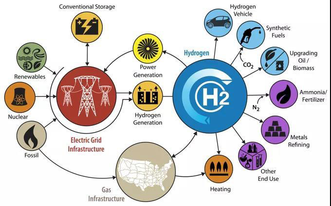 氫是一種零碳排放的能源載體,可以用于交通運(yùn)輸,作為石油精煉、氨生產(chǎn)的原料,以及金屬精煉和住宅部門的加熱和烹飪等方方面面。而且,氫氣有潛力成為整合不同基礎(chǔ)設(shè)施的能源載體,以提高經(jīng)濟(jì)效率、可靠性、靈活性,而且其中許多用途將有助于減少電力和交通部門的碳排放(2015年,電力和交通部門的碳排放分別占全球能源相關(guān)碳排放的約42%和24%)。氫還可以為電力部門提供大規(guī)模的長期(季節(jié)性)能量存儲。此外,氫能源存儲系統(tǒng)可以提供輔助電網(wǎng)服務(wù),如應(yīng)急、負(fù)荷跟蹤和調(diào)節(jié)儲備,這些服務(wù)可以提供額外的能量來源,從而降低電解制氫的成本。
