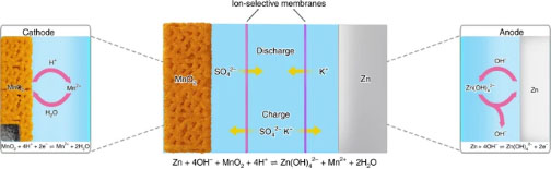 新型水系鋅-錳電池的結(jié)構(gòu)以及工作機制示意圖