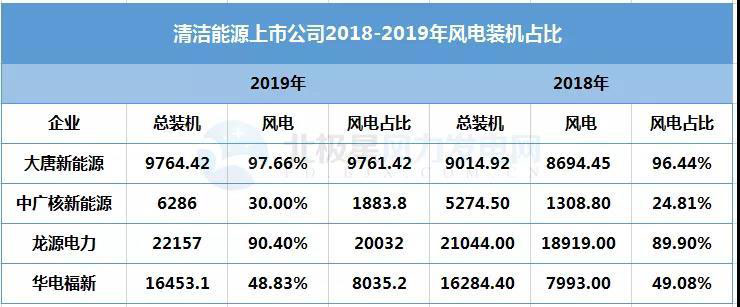 在風(fēng)電領(lǐng)域的上市公司中,另一股不容忽視的力量主要是國家能源集團(tuán)旗下的龍源電力、大唐集團(tuán)旗下大唐新能源、中廣核旗下的中廣核新能源、華電集團(tuán)旗下華電福新,另外還有三峽新能源雖未上市,但也于近期即將沖擊IPO。從這幾家新能源企業(yè)2019年業(yè)績來看,相比綜合類能源上市企業(yè)在盈利上更加具備優(yōu)勢。