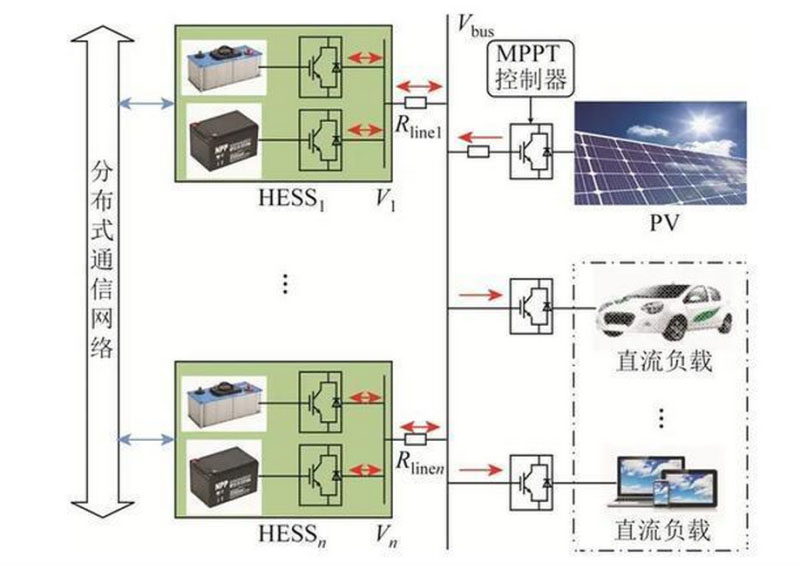 有學者則提出了一種分散式的HESS控制方法,蓄電池和超級電容分別采用虛擬電阻和虛擬電容下垂控制,根據(jù)不同的虛擬參數(shù)實現(xiàn)不同和相同儲能介質(zhì)間的功率分配。有學者同樣采用分散式控制結構,超級電容采用的是積分下垂控制,其本質(zhì)上與虛擬電容下垂控制相同,但同樣未考慮線路電阻的影響。不同于集中式控制,分布式控制不存在單點失效的風險,具有較高的可靠性。而相比于分散式控制,由于存在通信網(wǎng)絡,可以實現(xiàn)協(xié)調(diào)配合,因此又具有較高的經(jīng)濟性。