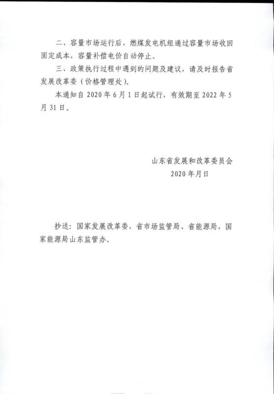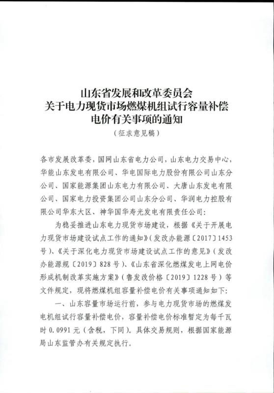 為穩(wěn)妥推進山東電力現(xiàn)貨市場建設(shè),根據(jù)《關(guān)于開展電力現(xiàn)貨市場建設(shè)試點工作的通知》(發(fā)改辦能源〔2017〕1453號)、《關(guān)于深化電力現(xiàn)貨市場建設(shè)試點工作的意見》(發(fā)改辦能源規(guī)〔2019〕828號)、《山東省深化燃煤發(fā)電上網(wǎng)電價形成機制改革實施方案》(魯發(fā)改價格〔2019〕1228號)等文件規(guī)定,現(xiàn)將燃煤機組容量補償電價有關(guān)事項通知如下: