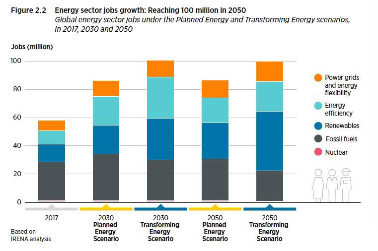 報(bào)告顯示,為了實(shí)現(xiàn)能源系統(tǒng)的深度去碳化,雖然需要新投約130萬億美元,但這類投資的社會(huì)經(jīng)濟(jì)收益將是巨大的。從現(xiàn)在到2050年,與常規(guī)情境相比,能源系統(tǒng)的轉(zhuǎn)型能使全球GDP多增加98萬億美元,并且將使可再生能源產(chǎn)業(yè)的就業(yè)增加近三倍,達(dá)到4200萬個(gè),并推動(dòng)能源效率相關(guān)的就業(yè)機(jī)會(huì)增加到2100萬,電網(wǎng)靈活性相關(guān)的就業(yè)增加到1500萬個(gè)。