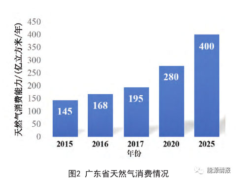 (2)分布式能源和6F 燃機(jī)將是廣東省新增氣電主體。當(dāng)前廣東省各地市擬規(guī)劃新增的天然氣發(fā)電項(xiàng)目主要是分布式能源項(xiàng)目和6F 機(jī)組,未來這將是廣東省電力行業(yè)新增天然氣需求的重要載體。廣東省天然氣消費(fèi)情況如圖2所示,到2020年,天然氣消費(fèi)量比2015年翻一番,比重達(dá)到一次能源的11%,到2025年將預(yù)計(jì)達(dá)到15%。