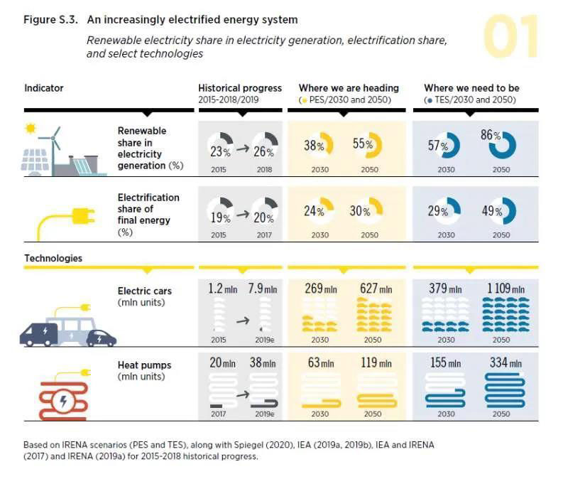 2018年可再生能源發(fā)電占全球發(fā)電量的26%,按照目前的規(guī)劃到2030年可達(dá)38%、2050年可達(dá)55%;但是按照巴黎氣候協(xié)定的要求2030年應(yīng)達(dá)57%、2050年應(yīng)達(dá)86%。
