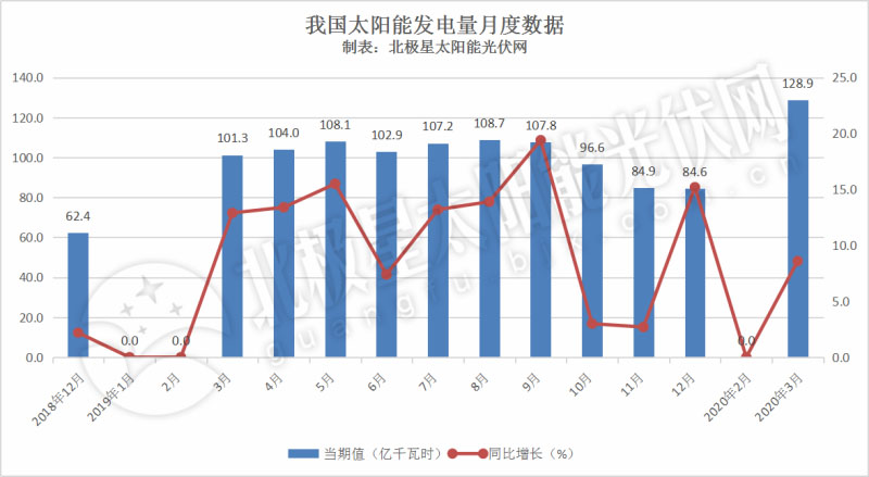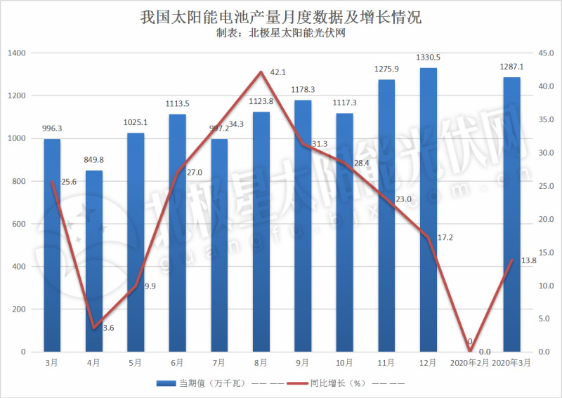 數(shù)據(jù)顯示,我國(guó)2020年3月份太陽(yáng)能電池(光伏電池)產(chǎn)量為1287.1萬(wàn)千瓦,較去年同期的996.3萬(wàn)千瓦,同比增長(zhǎng)13.8%;3月份我國(guó)太陽(yáng)能累計(jì)發(fā)電量為128.9億千瓦時(shí),同比增長(zhǎng)8.6%,1-3月累計(jì)發(fā)電量為310.1億千瓦時(shí),累計(jì)增長(zhǎng)10.9%。