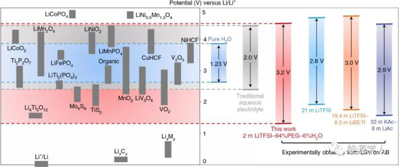 圖4. 各種水系電解質(zhì)和電位電極材料的電化學窗口穩(wěn)定性的比較