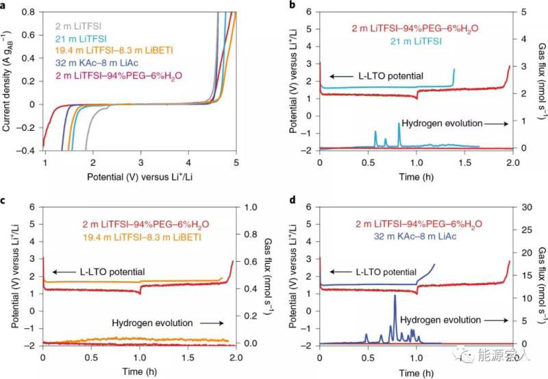 圖3. a)通過LSV確定的各種電解質(zhì)的電化學穩(wěn)定性窗口;b-d)在21m LiTFSI(b)、水合熔體19.4m LiTFSI-8.3m LiBETI(c)和32m KAC-8m LiAc(d)電解質(zhì)中進行的OEMS測試分別與2m LiTFSI-94%PEG-6%H2O的比較。