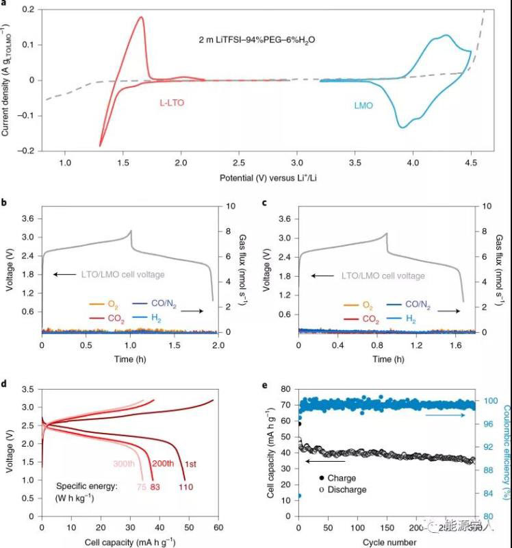 圖2. L-LTO/LMO全電池在2m LiTFSI-94%PEG-6%H2O電解質(zhì)中的電化學行為和OEMS。a)在2m LiTFSI-94%PEG-6%H2O中LMO和LTO的CV曲線;b, c)L-LTO/LMO全電池在2m LiTFSI-94%PEG-6%H2O中,在第一(b)和第十(c)的OEMS結(jié)果;d)在1C倍率下,L-LTO/LMO全電池在2m LiTFSI-94%PEG-6%H2O中第1、200和300次循環(huán)的充放電曲線;e)相應的長循環(huán)性能。