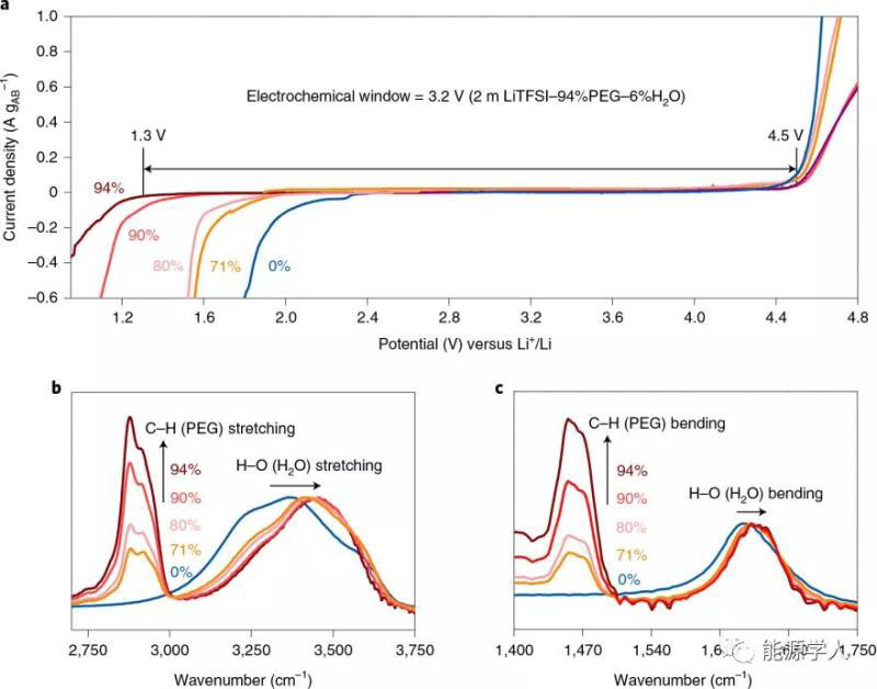 圖1. 分子擁擠型電解質(zhì)的電化學穩(wěn)定窗口和FTIR光譜。a)LSV測試2m LiTFSI-xPEG-(1-x)H2O(x=0,71,80,90,94%)的電化學穩(wěn)定性窗口;b, c)一系列2m LiTFSI-xPEG-(1-x)H2O電解質(zhì)的歸一化FTIR。