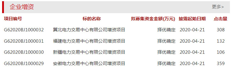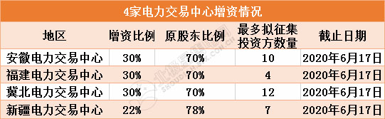 根據(jù)公告中顯示,四家電力交易中心的增資項(xiàng)目的截止日期為2020年6月17日,擬募集資金總額則均為“擇優(yōu)確定”。其中安徽電力交易中心、福建電力交易中心和冀北電力交易中心的擬募集資金對(duì)應(yīng)持股比例或股份數(shù)均為不超過(guò)30%,新疆電力交易中心公開(kāi)增資比例稍小,引入新的投資方持股合計(jì)22%以?xún)?nèi)。