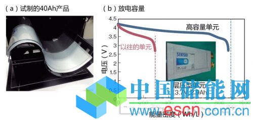 積水化學(xué)開發(fā)出了可利用涂布工序制造的鋰離子充電電池(a)。試制的層壓型單元實(shí)現(xiàn)了900Wh/L的能量密度。(圖(b)由《日經(jīng)電子》根據(jù)積水化學(xué)的資料制作)