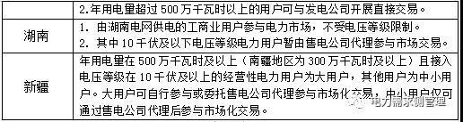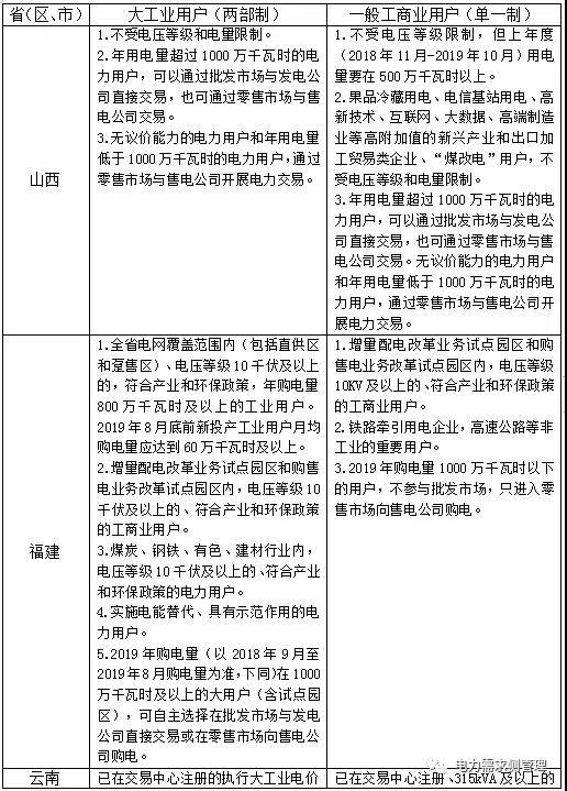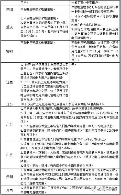 按照《關(guān)于全面放開經(jīng)營(yíng)性電力用戶發(fā)用電計(jì)劃的通知》(發(fā)改運(yùn)行〔2019〕1105 號(hào))要求,除居民、農(nóng)業(yè)、重要公用事業(yè)和公益性服務(wù)等行業(yè)電力用戶以及電力生產(chǎn)供應(yīng)所必需的廠用電和線損之外,逐步全面放開經(jīng)營(yíng)性領(lǐng)域電力用戶參與市場(chǎng)交易,且各類電力用戶應(yīng)符合國(guó)家產(chǎn)業(yè)政策要求,產(chǎn)品和工藝屬于《產(chǎn)業(yè)結(jié)構(gòu)調(diào)整指導(dǎo)目錄》(2019本)中淘汰類和限制類且執(zhí)行差別電價(jià)政策的電力用戶暫不參與市場(chǎng)化交易。除上述要求外,2020年部分地區(qū)對(duì)市場(chǎng)交易用戶準(zhǔn)入條件要求如下: