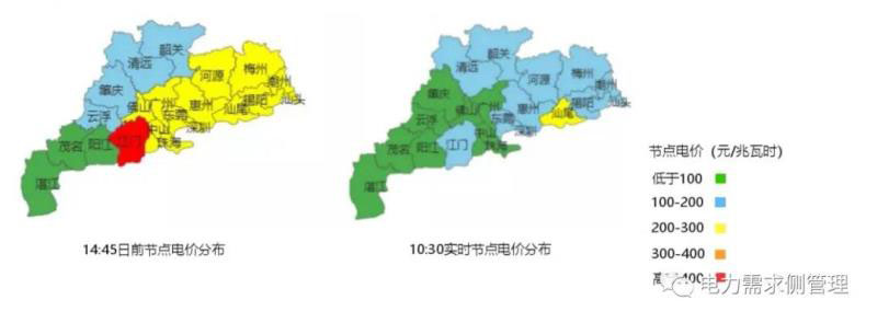 以廣東電力交易中心2019年10月27日現(xiàn)貨市場(chǎng)交易結(jié)果為例,日前市場(chǎng)發(fā)電側(cè)價(jià)格最低70元/兆瓦時(shí),最高895元/兆瓦時(shí),總成交電量7.45億千瓦時(shí),峰荷時(shí)刻14點(diǎn)45分江門市節(jié)點(diǎn)電價(jià)最高;實(shí)時(shí)市場(chǎng)發(fā)電側(cè)價(jià)格最低70元/兆瓦時(shí),最高347.11元/兆瓦時(shí),總成交電量7.04億千瓦時(shí),峰荷時(shí)刻轉(zhuǎn)移至10點(diǎn)30分,江門市節(jié)點(diǎn)電價(jià)降低至200元/兆瓦時(shí)以下。日前現(xiàn)貨價(jià)格作為市場(chǎng)主體的決策風(fēng)向標(biāo),有效地緩解了實(shí)時(shí)當(dāng)天系統(tǒng)高峰負(fù)荷場(chǎng)景下網(wǎng)絡(luò)阻塞情況。