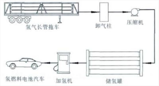 氫氣長管拖車將氫氣運(yùn)輸至加氫站后,裝有氫氣的半掛車與牽引車分離并和卸氣柱相連接。隨后氫氣進(jìn)入壓縮機(jī)內(nèi)被壓縮,并先后輸送至高壓、中壓、低壓儲(chǔ)氫罐中分級(jí)儲(chǔ)存。需要對(duì)汽車進(jìn)行加注服務(wù)時(shí),加氫機(jī)可以先后從氫氣長管拖車、低壓儲(chǔ)氫罐、中壓儲(chǔ)氫罐、高壓儲(chǔ)氫罐中按順序取氣進(jìn)行加注。