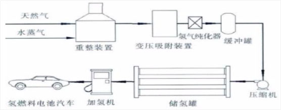 脫硫后的天然氣和水蒸氣在高溫、催化劑的條件下在重整裝置中反應(yīng)生成氫氣、一氧化碳以及二氧化碳等。隨后通過變壓吸附裝置(PSA)將氫氣分離出來。分離出來的氫氣進(jìn)一步在氫氣純化器中純化。本流程中純化的目的是進(jìn)一步除去一氧化碳、二氧化碳、甲烷等雜質(zhì),以達(dá)到燃料電池汽車對(duì)氫氣質(zhì)量的要求(氫氣體積分?jǐn)?shù)>99.9999%)。