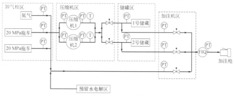 站內(nèi)電解水制氫加氫站工藝流程:水在電解裝置的陰陽兩極分別產(chǎn)生氫氣和氧氣。氫氣進(jìn)入氣水分離器進(jìn)行干燥,干燥后在氫氣純化器中純化。本流程中純化的目的是除去氧氣及雜質(zhì),以達(dá)到燃料電池汽車對(duì)氫氣質(zhì)量的要求(氫氣體積分?jǐn)?shù)>99.999 9%)。純化后的氫氣通過緩沖罐后進(jìn)入壓縮機(jī)內(nèi)被壓縮,并先后輸送至高壓、中壓、低壓儲(chǔ)氫罐中分級(jí)儲(chǔ)存。需要對(duì)汽車進(jìn)行加注服務(wù)時(shí),加氫機(jī)可以先后從低壓儲(chǔ)氫罐、中壓儲(chǔ)氫罐、高壓儲(chǔ)氫罐中按順序取氣進(jìn)行加注。