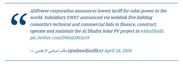 4月28日,隨著下面這條推文的發(fā)布,阿聯(lián)酋政府的媒體宣布,阿聯(lián)酋水電公司(EWEC)去年7月啟動(dòng)的1.5GW光伏發(fā)電招標(biāo),獲得了世界最低的太陽(yáng)能發(fā)電價(jià)格。