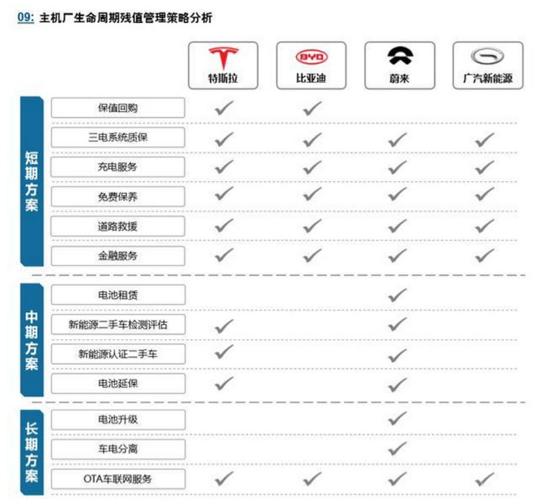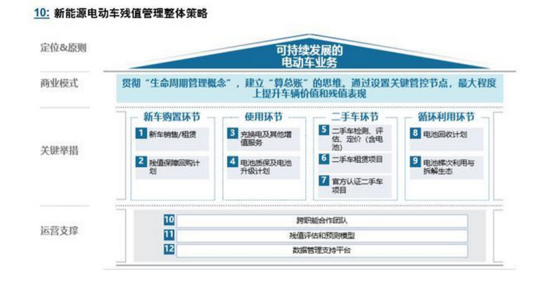 主機(jī)廠已經(jīng)針對(duì)新能源車殘值以及整個(gè)流通過程的特殊 性加以布局和考慮,但是體系化建設(shè)布局仍需加強(qiáng),應(yīng) 逐漸從“點(diǎn)狀”戰(zhàn)術(shù)性手段過渡到覆蓋車輛生命周期的 “鏈狀”戰(zhàn)略性管理體系。