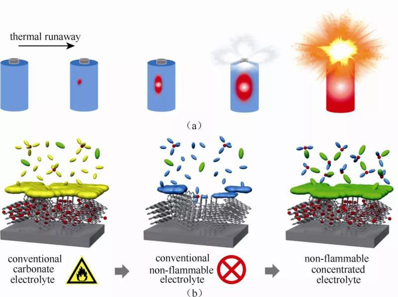 商品鋰離子電池具有能量和功率密度高、無記憶效應(yīng)、循環(huán)壽命長和環(huán)境友好等優(yōu)點,其應(yīng)用正迅速從消費電子品領(lǐng)域拓展到電動汽車和新能源儲能領(lǐng)域。然而,近年來,隨著鋰離子電池的大規(guī)模推廣應(yīng)用,在世界范圍內(nèi),每年都會發(fā)生大量與鋰離子電池濫用熱失控相關(guān)的安全事故,學(xué)術(shù)界和產(chǎn)業(yè)界也在不斷重視和加強對鋰離子電池安全性的探究和提高(圖1)。造成熱失控(冒煙、起火燃燒、爆炸)的濫用條件主要有機械濫用(如擠壓、針刺)、電濫用(如過充、內(nèi)部短路)和熱濫用(如過熱沖擊)等。從鋰離子電池?zé)崾Э剡^程的鏈式反應(yīng)定性描述圖中(圖2)可以看出,電解液在鋰離子電池?zé)崾Э剡^程中扮演的角色非常關(guān)鍵。商品鋰離子電池中通常采用碳酸酯基電解液,由鋰鹽(如六氟磷酸鋰LiPF6)與閃點低、高度可燃、電化學(xué)穩(wěn)定性差的碳酸酯溶劑(如碳酸乙烯酯EC、碳酸丙烯酯PC、碳酸二甲酯DMC、碳酸二乙酯DEC、碳酸甲乙酯EMC)組成。目前,從材料角度看,防止鋰離子電池?zé)崾Э仄鸹鹑紵ǖ陌踩愿倪M策略眾多,如采用阻燃電解液、阻燃型耐熱收縮隔膜、固態(tài)電解質(zhì)、結(jié)構(gòu)穩(wěn)定性高的電極材料(如磷酸鐵鋰LFP)等。這其中,發(fā)展高安全性阻燃電解液是最經(jīng)濟簡單的策略,能夠有效降低鋰離子電池?zé)崾Э厝紵L(fēng)險(概率),并極大降低熱失控帶來的人員財產(chǎn)傷害。本文將結(jié)合文獻資料首先介紹燃燒機理、阻燃機理和阻燃測試方法;再闡述鋰離子電池對阻燃電解液的性質(zhì)要求;對阻燃電解液進行分類探討論述,包括基于阻燃添加劑的阻燃電解液、基于阻燃溶劑(共溶劑)的阻燃電解液、基于高濃度鋰鹽的阻燃電解液、基于離子液體的阻燃電解液和阻燃型凝膠聚合物電解質(zhì);最后,對高安全性阻燃電解液未來的研究方向進行展望。