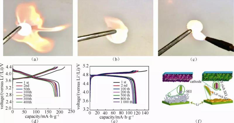 圖16 氟代醚(HFE)和氟代碳酸酯(F-EMC和FEC)組成的不燃全氟電解液阻燃效果及其在金屬鋰電池中的應(yīng)用