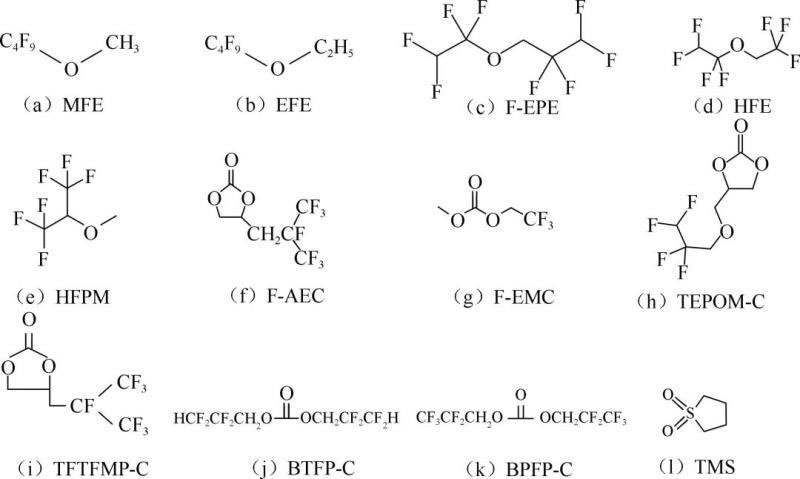 氟代醚類和氟代碳酸酯類有機化合物的特點是閃點高或者是沒有閃點。該類化合物作為阻燃溶劑是通過稀釋高揮發(fā)和易燃性共溶劑起作用,所以在阻燃電解液中占比較大(通常大于70%)。另外,借助氟元素的吸電子效應(yīng),該類氟代化合物溶劑分子更容易在碳基負極表面還原,優(yōu)化SEI膜,改進阻燃電解液與電極材料的電化學(xué)兼容性,提高電池的性能。文獻報道過的用于鋰電池阻燃電解液的氟代醚有:甲基九氟丁醚[methyl nonafluorobutyl ether ,MFE,圖15(a)],乙基九氟丁醚[ethyl nonafluorobutyl ether,EFE,圖15(b)],DMTP[或稱為TMMP,圖12(m)],1,1,2,2-四氟乙基2,2,3,3-四氟丙醚[1,1,2,2-tetrafluoroethyl-2,2,3,3- tetrafluoropropyl ether,F(xiàn)-EPE,圖15(c)],1,1,2,2-四氟乙基-2,2,2-三氟乙基醚[1,1,2,2- tetrafluoroethyl 2,2,2-trifluoroethyl ether,HFE,圖15(d)],六氟異丙基甲醚[1,1,1,3,3,3-hexafluoroi- sopropyl methyl ether,HFPM,圖15(e)]。氟代碳酸酯的代表性化合物有:氟代環(huán)狀碳酸酯[F-AEC,圖15(f)],三氟乙基甲基碳酸酯[3,3,3-fluoroethylmethyl carbonate,F(xiàn)-EMC,圖15(g)],TFPOM-C[4-(2,2,3,3-tetrafluoropropo- xymethyl)-1,3-dioxolan-2-one,圖15(h)], TFTFMP- C[4-(2,3,3,3-tetrafluoro-2-trifluoromethyl-propyl)- 1,3- dioxolan-2-one,圖15(i)],雙(四氟丙基)碳酸酯[bis(2,2,3,3-tetrafluoro-propyl) carbonate,BTFP-C,圖15(j)],雙(五氟丙基)碳酸酯[bis(2,2,3,3,3- pentafluoro-propyl) carbonate,BPFP-C,圖15(k)]。最近,F(xiàn)AN等將氟代醚HFE、氟代碳酸酯F-EMC和FEC(氟代碳酸乙烯酯)聯(lián)用開發(fā)了一種耐高電壓的不燃全氟電解液[圖16(a)~(c)],在高鎳三元材料[NCM811,圖16(d)]和5 V磷酸鈷鋰[LCP, 圖16(e)]金屬鋰電池中取得了巨大的成功。相比非全氟電解液,該不燃電解液能夠保護金屬鋰片,抑制鋰枝晶的產(chǎn)生,減小電池短路風(fēng)險[圖16(f)]。另外,閃點較高,氧化穩(wěn)定性高的環(huán)丁砜[sulfolane,TMS,圖15(l)],己二腈(adiponitrile,ADN)也被用作阻燃電解液的主溶劑。