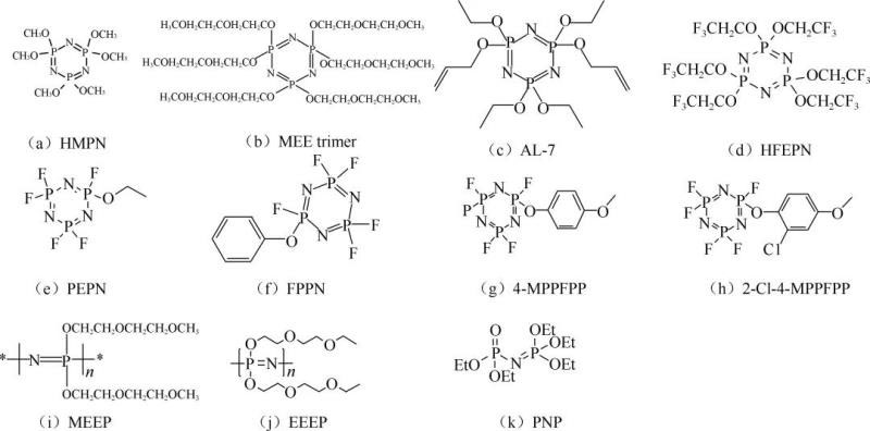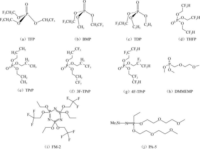 研究最早的短碳鏈烷基磷酸酯類阻燃添加 劑,如磷酸三甲酯[trimethyl phosphate,TMP,圖4(c)]、磷酸三乙酯[triethyl phosphate,TEP,圖4(i)]、磷酸三丁酯[tributylphosphate,TBP,圖4(b)]等,捕捉燃燒自由基能力強,阻燃效果良好。但是這些烷基磷酸酯通常黏度較大且與電極材料(尤其碳基負極)兼容性差,加入基液后在提高電解液阻燃性的同時會降低電解液的離子電導(dǎo)率并極大縮短電池循環(huán)壽命。提高烷基磷酸酯電化學(xué)穩(wěn)定性的途徑有:① 芳香基團(苯基)取代烷基基團,如磷酸三苯酯[triphenylphosphate,TPP,圖4(a)]、4-異丙基苯基二苯基磷酸酯[4-isopropyl phenyl diphenyl phosphate,IPPP,圖4(d)]、三(4-甲氧基苯基)磷酸酯[tri-(4-methoxythphenyl) phosphate,TMPP,圖4(e)]、磷酸甲苯二苯酯[cresyl diphenyl phosphate,CDP,圖4(f)]、二苯基磷酸辛酯[diphenyl octyl phosphate,DPOF,圖4(g)];② 增加烷基基團的碳含量,如磷酸三辛酯[trioctyl Phosphate,TOP,圖4(h)];③ 采用環(huán)狀磷酸酯,如乙烯乙基磷酸酯[ethylene ethyl phosphate,EEP,圖4(j)];最近,TSUBOUCHI等通過雙三氟甲烷磺酰亞胺鉀(KTFSA)添加劑修飾負極SEI膜來提高TMP基(50%,體積百分數(shù))阻燃電解液與石墨負極的兼容性、庫侖效率提升明顯。LIU等設(shè)計了一種非常新穎的熱“智能”阻燃的無紡布靜電紡絲隔膜,靜電紡絲纖維由TPP內(nèi)核和偏氟乙烯-六氟丙烯共聚物(PVDF-HFP)外殼組成,鋰離子電池正常運行時,TPP不會對電池的循環(huán)性能造成影響,但當電池過熱時,PVDF-HFP外殼熔斷破碎,釋放出TPP阻燃劑,捕捉燃燒自由基,從而阻止鋰離子電池?zé)崾Э厝紵ā?