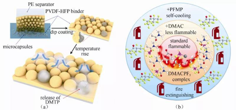 圖13 (a)將包裹有DMTP的PMMA聚合物微膠囊用PVDF-HFP黏結(jié)劑固定在聚乙烯隔膜上;(b)具有雙重保護 機制的復(fù)合電解液