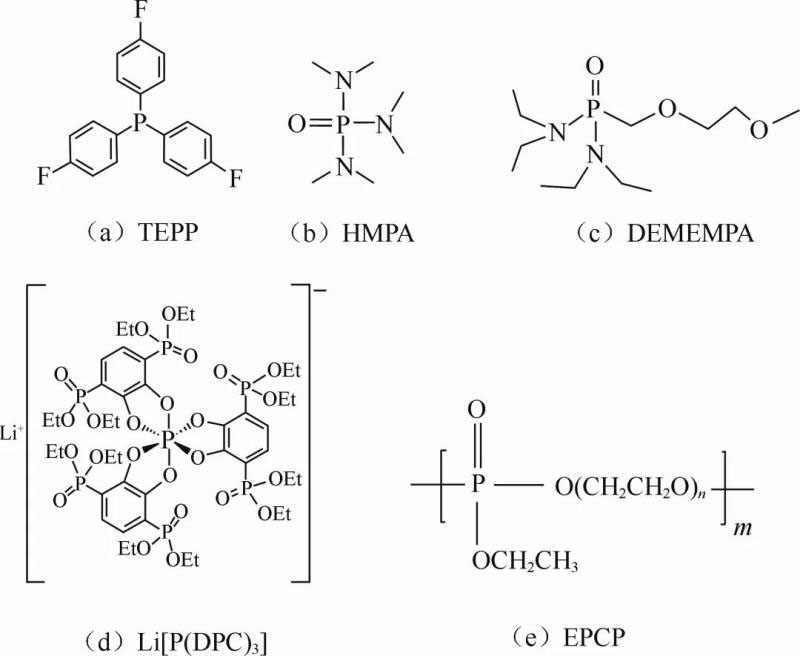 已報道的含磷阻燃添加劑還有三(4-氟苯基)磷化氫[tris(4-fluorophenyl) phosphine,TFPP,圖11(a)、六甲基磷酰三胺[hexamethylphosphoramide,HMPA,圖11(b)]、二(N,N-二乙基)甲氧基乙氧基甲基磷酰胺[bis(N,N-diethyl)(2-methoxyethoxy) methylphos- phonamidate,DEMEMPA,圖11(c)]、富含磷?;淖枞茧x子-新型阻燃鋰鹽[Li[P(DPC)3],圖11(d)]、聚(磷酸乙酯-乙二醇)共(寡)聚物[EPCP,圖11(e)]。值得注意的是,最近,WANG等將離子傳導(dǎo)性優(yōu)異的EO片段嵌入到磷酸酯中形成具有阻燃性EPCP寡聚物,該寡聚物添加量為15%時,電解液完全不燃,且電解液的離子電導(dǎo)率不受EPCP加入影響。另外EPCP還有利于電極材料界面的穩(wěn)定,因此,采用鈷酸鋰正極的鋰離子電池(LiCoO2/Li)循環(huán)性能和倍率性能均有所提升。