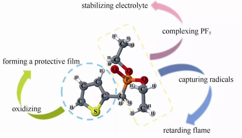 (1)發(fā)展電極界面兼容性優(yōu)異的多功能阻燃添加劑或阻燃溶劑,即不僅具有阻燃效果,而且具有界面成膜功能;或?qū)⒆枞紕┡c功能成膜添加劑聯(lián)用,發(fā)揮協(xié)同作用。