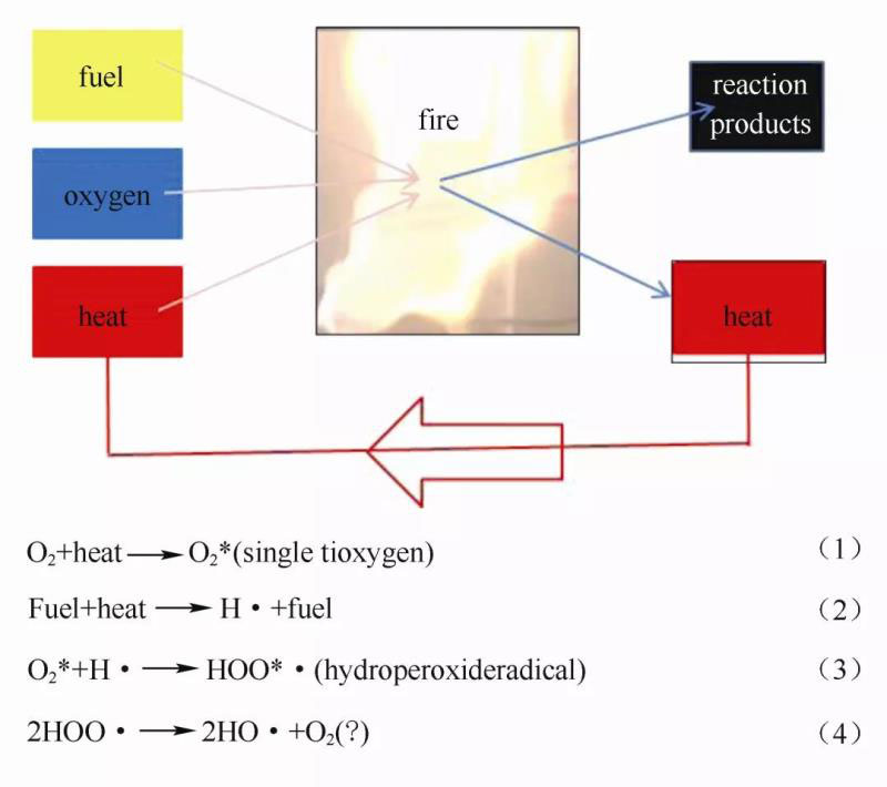 燃燒過程是一個復(fù)雜的化學(xué)反應(yīng)過程(圖3),需同時具備3個重要條件,即熱(heat)、氧化劑(oxidizer)和燃料(fuel),燃料是燃燒的物質(zhì),氧化劑是產(chǎn)生氧氣讓燃料可以燃燒的物質(zhì),而熱是驅(qū)動燃燒過程的能量。維持燃燒通常依賴自由基的產(chǎn)生,基態(tài)O2吸收熱量產(chǎn)生反應(yīng)活性非常高的單線態(tài)氧(singlet oxygen, O2*),如式(1)所示;與此同時,有機質(zhì)(燃料)吸收熱量產(chǎn)生氫自由基(H?),如式(2)所示;O2*與H?結(jié)合產(chǎn)生氫過氧化物自由基(HOO*?),如式(3)所示;HOO*?分解產(chǎn)生氫氧自 由基(HO?),如式(4)所示。這些自由基壽命 極短但反應(yīng)活性非常強,會產(chǎn)生大量的熱/火焰??傊?,這種自由基機制意味著氫自由基(H?)、單線態(tài)氧(O2*)和氫氧自由基(HO?)在維持燃燒過程中扮演著極為重要的角色。