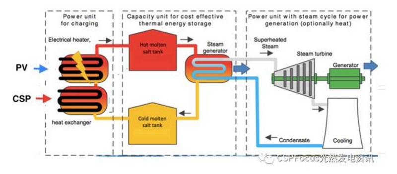 該技術(shù)思路的提出單位德國(guó)TSK Flagsol技術(shù)總監(jiān)Mark Schmitz也對(duì)此進(jìn)行了詳細(xì)解釋:這是我們幾年前研發(fā)出的一個(gè)新概念,槽式光熱發(fā)電系統(tǒng)在正常運(yùn)行時(shí)的工作溫度約在400℃左右,而蒸汽溫度越高對(duì)汽輪機(jī)提升電站整體發(fā)電效率更有利,因此我們想到將光伏系統(tǒng)中的多余電力也放入儲(chǔ)熱罐中,熔鹽通過(guò)電加熱溫度可達(dá)到565℃左右,大大提高了發(fā)電效率。