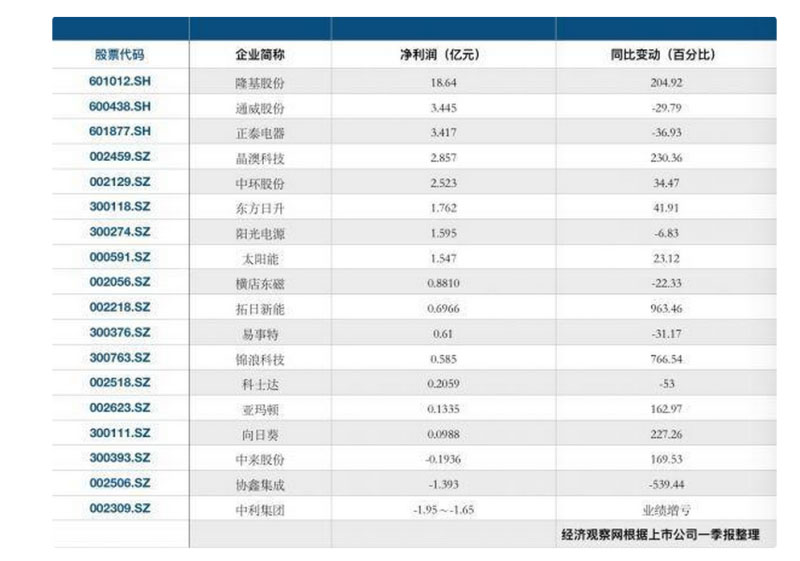 根據(jù)經(jīng)濟觀察報梳理的18家光伏上市公司2020年一季度業(yè)績表現(xiàn),隆基股份以18.64億的歸母凈利位居第一,同比增幅達204.92%;通威股份、正泰電器分別以3.445億元、3.417億元位列其后;隨后是晶澳科技和中環(huán)股份,歸母凈利潤為別為2.857億元和2.523億元;東方日升、陽光電源、太陽能則以1.762億元、1.595億元和1.547億元的凈利占據(jù)“億元級別”的三個席位。