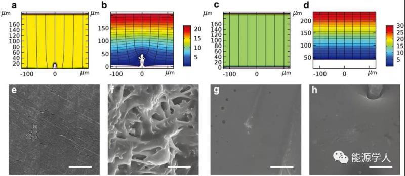 圖2. Li金屬(a,b)和Na-K合金(c,d)負(fù)極在原始(a,c)和還原(b,d)狀態(tài)下沉積的COMSOL多物理場(chǎng)模擬結(jié)果;Li對(duì)稱(chēng)電池在循環(huán)前(e)后(f) Li表面和Na-K對(duì)稱(chēng)電池在循環(huán)前(g)后(h) Na-K表面的SEM圖像