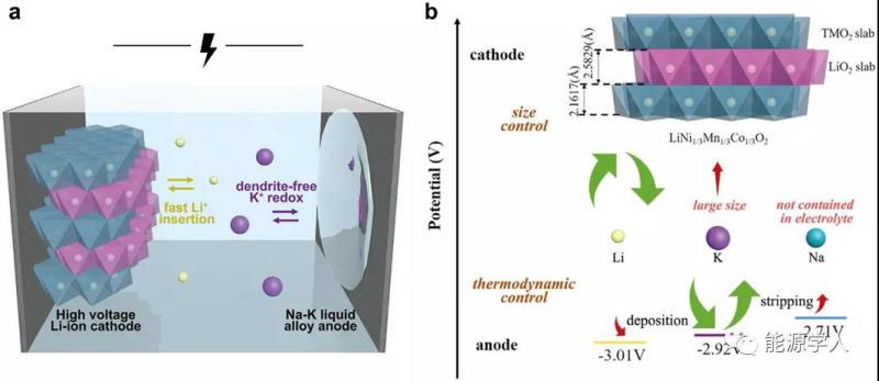 式中,E為反應(yīng)電勢(shì),F(xiàn)為法拉常數(shù),n為電荷轉(zhuǎn)移數(shù)。如圖1b所示,在放電過(guò)程中,K+在Na+之前被氧化(?2.92 V<?2.71 V),而在充電過(guò)程中,K+在Li+之前被沉積(?2.92 V>?3.01 V)。對(duì)于正極,TMO2層和LiO2層交替堆疊,構(gòu)建了LiNi1/3Mn1/3Co1/3O2晶體,其中LiO2層的層間距為2.58 ?。Li+、Na+和K+的半徑分別為0.76、1.02和1.38 ?。由于沒(méi)有向電解液中添加鈉鹽,并且K+比正極中的Li+嵌入通道大(2.76 ?>2.58 ?),因此K+無(wú)法嵌入鋰中,從而實(shí)現(xiàn)了對(duì)Li+插層的控制。總體而言,整個(gè)電化學(xué)過(guò)程可根據(jù)負(fù)極和正極的熱力學(xué)偏好和尺寸限制進(jìn)行調(diào)整,使無(wú)枝晶的LM電極和穩(wěn)定的鋰離子正極結(jié)合,這有望實(shí)現(xiàn)高容量。