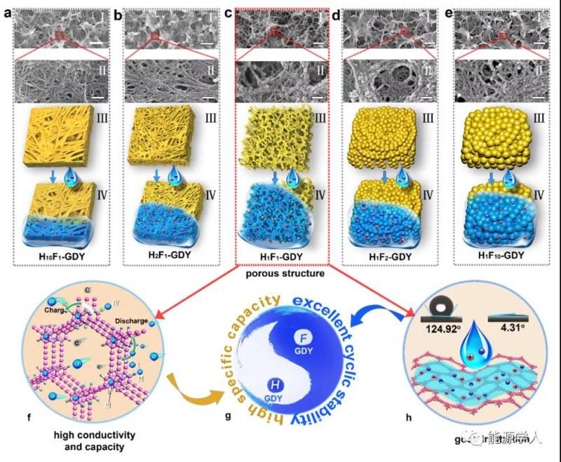 圖4. HxFy-GDY形貌演變示意圖(a-e)HxFy-GDY形貌演變及界面浸潤性示意圖(f-h)H1F1-GDY的儲鋰優(yōu)勢。