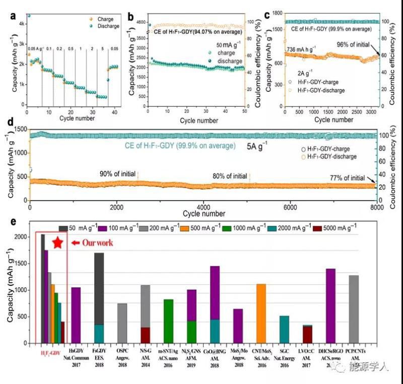 圖2.H1F1-GDY的儲鋰性能(a)倍率性能(b-d)0.05, 2,5 A/g電流密度下的循環(huán)穩(wěn)定性能(e)H1F1-GDY的儲鋰性能與近些年報道的材料性能對比圖。