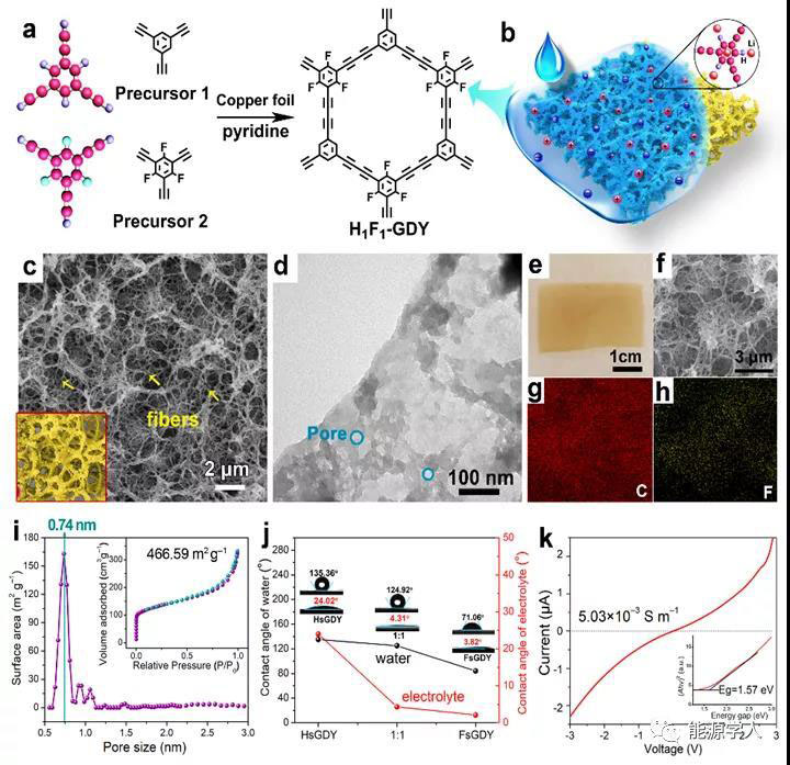 在該工作中,通過改變偶聯(lián)前體,自下而上制備了H1F1-GDY。由于元素的定位取代,結(jié)構(gòu)中大量含有的是42-C的六邊形大環(huán)。利用FT-IR,XPS,Raman,EDS等表征了材料中H/F的比例及分布,并測試了材料的部分物理性質(zhì)。如圖1所示,材料具有纖維交織的連續(xù)多孔結(jié)構(gòu),元素面掃譜圖顯示F元素均勻分布于結(jié)構(gòu)中??讖椒治鲲@示材料具有相對單一的主孔分布,對應(yīng)單一的AB堆積形式。另外,得益于粗糙的界面形貌及F元素?fù)诫s,材料顯示出優(yōu)異的電解液浸潤性。通過I-V曲線分析,測得材料的導(dǎo)電性約為GDY的20倍。結(jié)果表明,材料實現(xiàn)了孔結(jié)構(gòu)、浸潤性及導(dǎo)電性三種物理化學(xué)性質(zhì)的協(xié)同優(yōu)化。