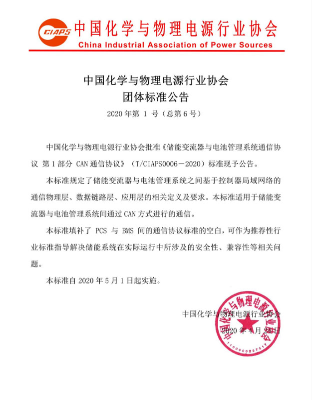 中國(guó)化學(xué)與物理電源行業(yè)協(xié)會(huì)批準(zhǔn)《儲(chǔ)能變流器與電池管理系統(tǒng)通信協(xié)議 第1部分 CAN通信協(xié)議》(T/CIAPS0006―2020)標(biāo)準(zhǔn)現(xiàn)予公告。