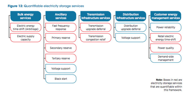 國際可再生能源機(jī)構(gòu)(IRENA)發(fā)布的一份調(diào)查報(bào)告證明使用儲能容量作為電網(wǎng)電源備份可能會很棘手,因此儲能系統(tǒng)評估框架(ESVF)框架只考慮了可提供量化服務(wù)(參見下圖中的紅色方框)。