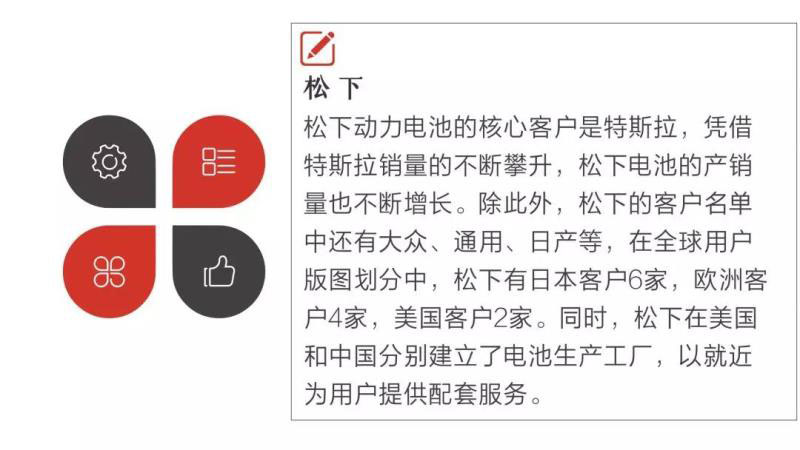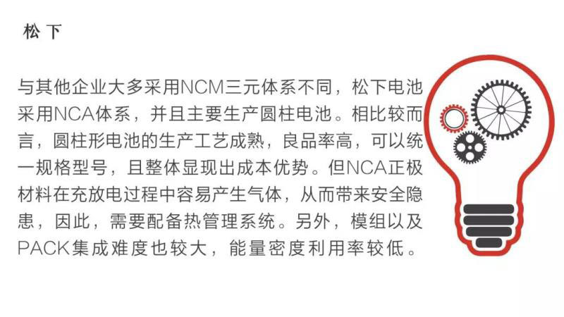 當(dāng)下,松下已開(kāi)發(fā)出鎳鈷錳酸鋰、鎳鈷鋁酸鋰等鋰電池,并已為企業(yè)配套。在產(chǎn)品開(kāi)發(fā)中,為了解決鎳氧化物帶來(lái)的熱穩(wěn)定性低和安全方面的問(wèn)題,松下在正極材料表面進(jìn)行了納米涂層處理,特別注重通過(guò)“松下固溶液Panasonic Solid Solution(PSS)”等技術(shù)提高安全性。