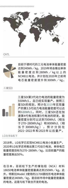 總體來(lái)看,各家企業(yè)在提高能量密度的路上,不約而同地把目光瞄向了三元體系,高鎳化成為共識(shí)。在這一過(guò)程中,鎳鈷錳(NCM)或者NCA成為提升能量密度的法寶,電池類(lèi)型也從NCM523發(fā)展到NCM622,如今NCM811電池也已實(shí)現(xiàn)量產(chǎn)。不過(guò),盡管各大企業(yè)對(duì)高比能量的發(fā)展路線(xiàn)有了一致認(rèn)識(shí),但在這一競(jìng)賽中暫時(shí)也分出了高低。目前,松下憑借21700電池的高能量密度領(lǐng)先于其他企業(yè),三星SDI落后于其他對(duì)手,處于墊底位置。