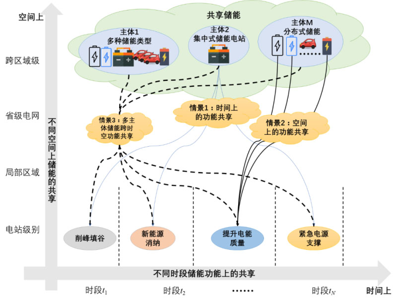 情景1:?jiǎn)蝹€(gè)儲(chǔ)能電站在不同時(shí)段以多功能復(fù)用的方式實(shí)現(xiàn)時(shí)間上的功能共享;情景2:歸屬同一主體但地理位置分散的分布式儲(chǔ)能,其通過在多個(gè)分布式儲(chǔ)能間進(jìn)行同種功能的分?jǐn)倢?shí)現(xiàn)空間上的功能共享,如河南16個(gè)儲(chǔ)能電站同時(shí)進(jìn)行河南電網(wǎng)調(diào)峰,實(shí)現(xiàn)單個(gè)儲(chǔ)能電站難以發(fā)揮的功能;情景3:歸屬不同主體且地理位置分散的多種儲(chǔ)能形式,通過場(chǎng)景1和場(chǎng)景2中功能共享模式實(shí)現(xiàn)多主體儲(chǔ)能的跨時(shí)空功能共享。