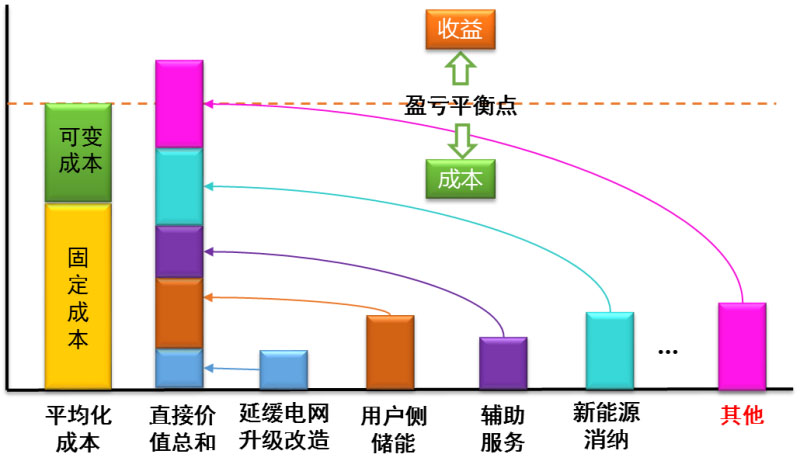 其次,盈利模式豐富方面,可通過完善市場(chǎng)機(jī)制、開發(fā)儲(chǔ)能靈活BMS、EMS管理系統(tǒng)實(shí)現(xiàn)儲(chǔ)能的多功能復(fù)用,實(shí)現(xiàn)儲(chǔ)能價(jià)值疊加?;诙鄨?chǎng)景復(fù)用盈利模式下的儲(chǔ)能綜合價(jià)值不再是原先從項(xiàng)目角度分析的單一直接價(jià)值,而是從單一價(jià)值到綜合價(jià)值的拓展。單個(gè)儲(chǔ)能多功能復(fù)用、多個(gè)儲(chǔ)能集中調(diào)度管控及多渠道成本回收的多元價(jià)值構(gòu)成是未來儲(chǔ)能主要盈利模式。由單一商業(yè)價(jià)值到綜合商業(yè)價(jià)值,不僅儲(chǔ)能成本回收渠道拓寬,而且利益分配模式及其衍生出的一系列價(jià)格機(jī)制將帶來儲(chǔ)能商業(yè)邏輯的根本性變化。